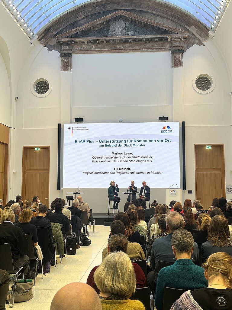 Auf dem bundesweiten EhAP-Plus-Netzwerktreffen des Bundesministeriums für Arbeit und Soziales am 27. und 28.01.2026 im Konferenzzentrum Mauerstraße in Berlin kam unser Kollege Till Meinelt in einem Podiumsgespräch mit dem ehemaligen Oberbürgermeister von Münster und Städtetagspräsidenten a. D. Markus Lewe ins Gespräch.